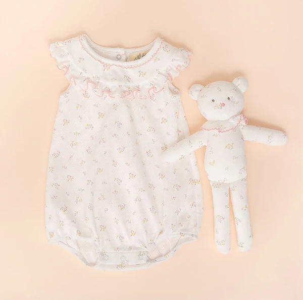 This beautiful Albetta Ditsy Pointelle romper has a vintage heirloom design with a pretty ruffle frill trim collar. Made from super soft pointelle jersey cotton in a new delicate pink floral print, the romper comes with beautiful frill trims. The comfy romper design with its short-sleeves is perfect for sunny days and active little ones, and makes this ditsy romper both beautiful and super comfortable.