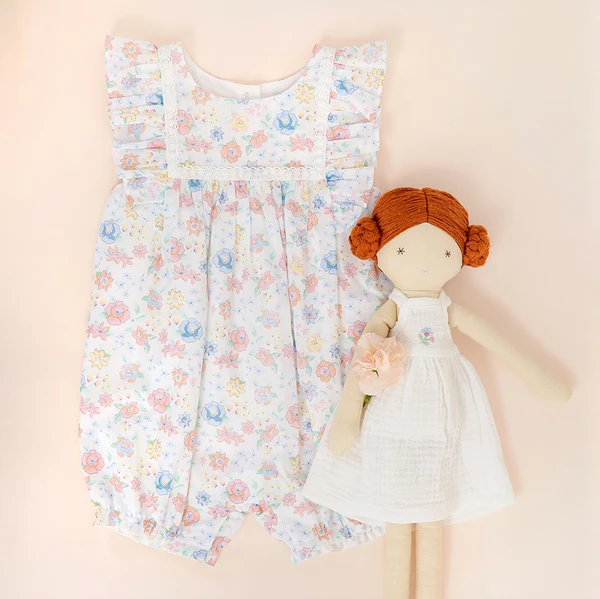 This beautiful floral folie lace Albetta romper has a vintage heirloom design, with sweet ruffle frill details, an all-over vintage-style floral print, and delicate picot edging. Made from 100% organic cotton, the romper features pretty lace frill trims and details on the cuffs, as well as a delicate rosy pink, sunshine yellow, and baby blue bloom printed fabric to give this retro style a modern feel.