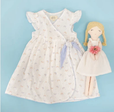 This beautiful Albetta mini rainbow print muslin crossover dress has a vintage heirloom design, with sweet ruffle frill trim details on the cuffs and a cross-over style fastened with a beautiful bow. Made from super soft muslin in the new delicate mini rainbow print, the dress comes with pretty frill trims and hand-embroidered details, with the easy crossover style perfect for active little ones making this magical rainbow muslin dress both beautiful and super comfortable.