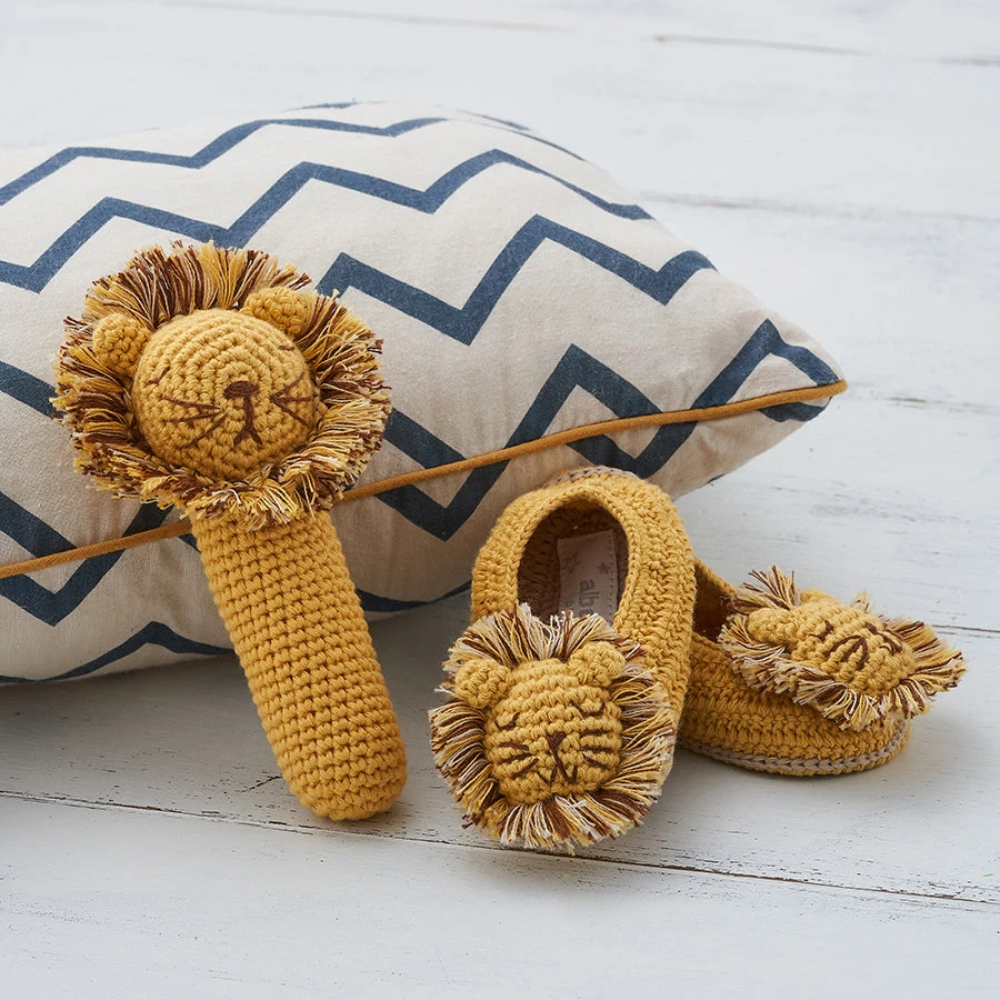 Sonaglio in maglia – Leone Un simpatico sonaglio a forma di leoncino che sarà la gioia di qualsiasi bambino! Disegnato e fatte a mano per i più piccoli, è ideale fin dalla nascita. Muovendolo si sente un delicato suono che stimola curiosità ed interesse nel neonato. Se lo si desidera può essere acquistato in coordinato con altri prodotti della stessa linea. Dettagli: fatto a mano da artigiani prodotto in Vietnam materiale: 100% cotone con imbottitura di poliestere alto circa 15cm