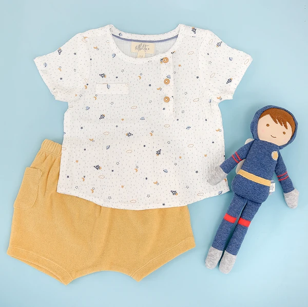 This beautifully printed Albetta space gauze shirt set has a shirt made from the softest 100% organic gauze, baggy mustard yellow bottoms in snuggly towelling, and features a cute ditsy space-themed print. The top and bottoms come with sweet pockets, with buttons down the front of the top for a bright pop of colour. The matching baggy towelling shorts are perfect for any little active ones who love to roam around! The bold colours and iconic Albetta attention to detail make this short-sleeve shirt set perfect for any curious and daring little astronaut explorers you may know!