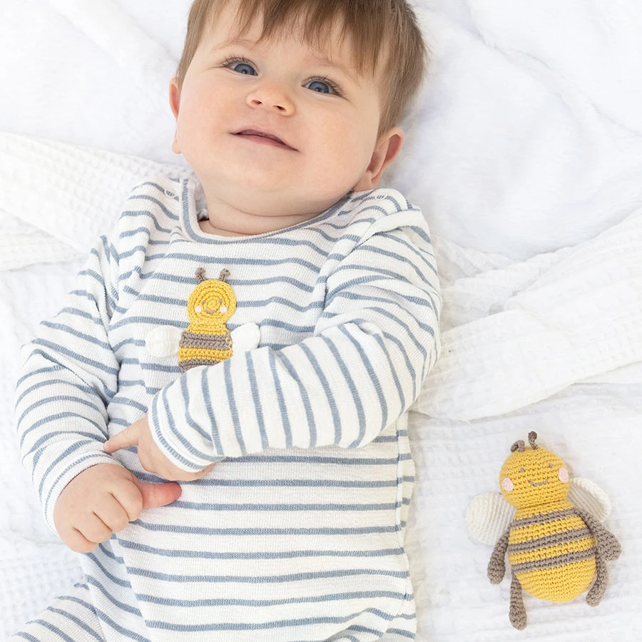 Tutina con dettaglio all’uncinetto – Ape La sua prima tutina, morbida e confortevole, senza piedini, si apre al cavallo e alle spalle con bottoni a pressione. Se lo si desidera può essere acquistata in coordinato con il sonaglio dello stesso soggetto. Dettagli: 100% cotone, da fonti di produzione sostenibili (BCI) prodotto in modo etico in Vietnam dettagli in maglia fatti a mano da artigiani testato OEKO-TEX per sostanze nocive bottoni automatici privi di nichel e piombo lavabile in lavatrice a 30° taglia 0-3, 3-6 e 6-12 mesi