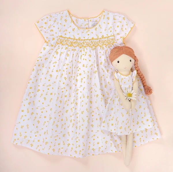 This beautiful Albetta wild bee and floral print dress has a vintage heirloom design with pretty hand-smocked details. Made from super-soft cotton in the new delicate wild bee print, the short-sleeve dress comes with beautiful frill and ruffle trims and hand-embroidered details. The airy, floaty design is perfect for warm summer days and active little ones, and make this summery dress both beautiful and super comfortable.