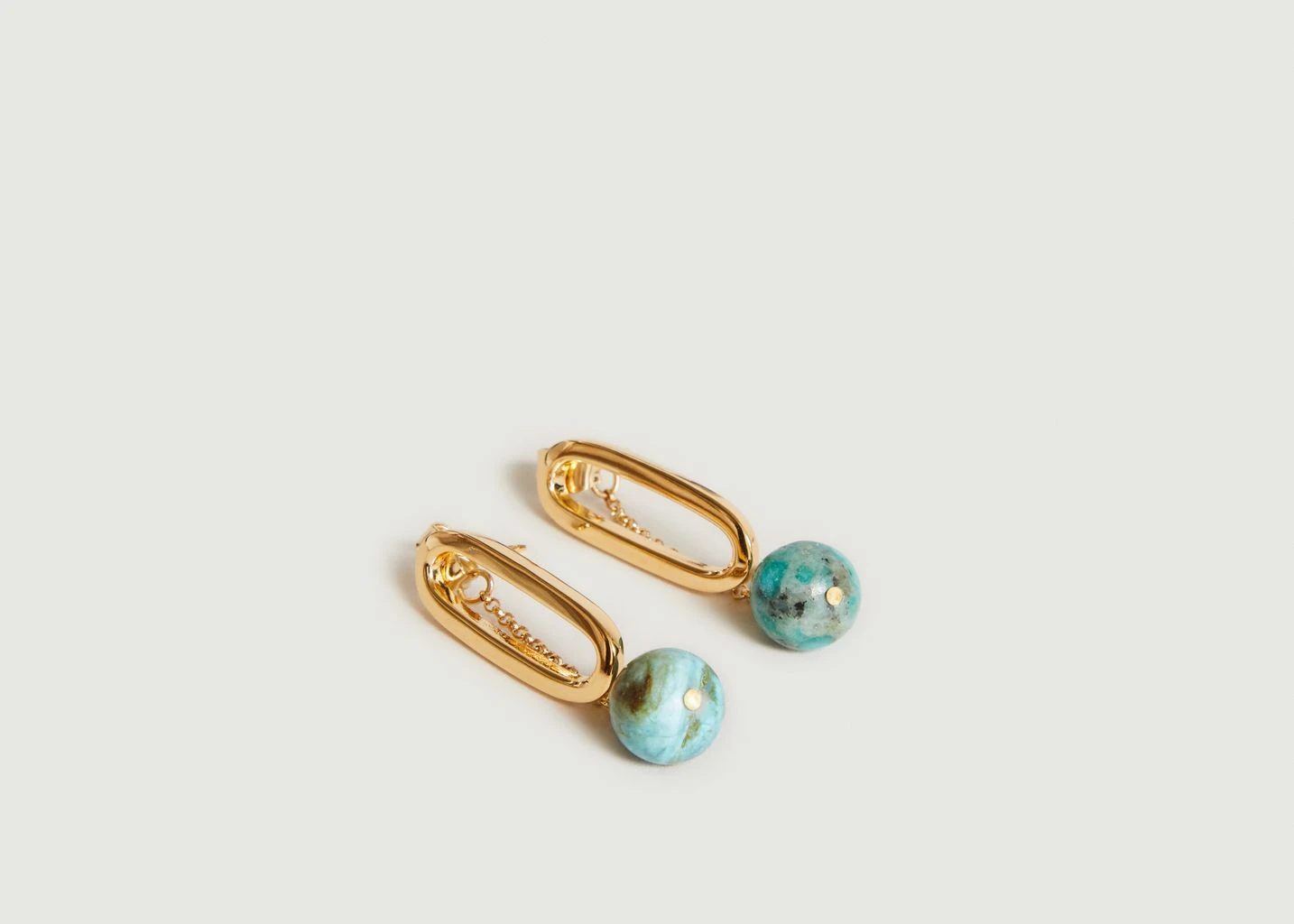 Earrings in brass gilded with 24 carat gold and decorated with African blue opals. Handmade in Paris. The shape, color and texture of the pearls and semi-precious stones may vary. With the African blue opal at its heart, the Xanadu collection is full of energy, born from the clash of raw materials. Eloquent jewellery with character! Adopt these earrings with a dress or a casual outfit for everyday wear.