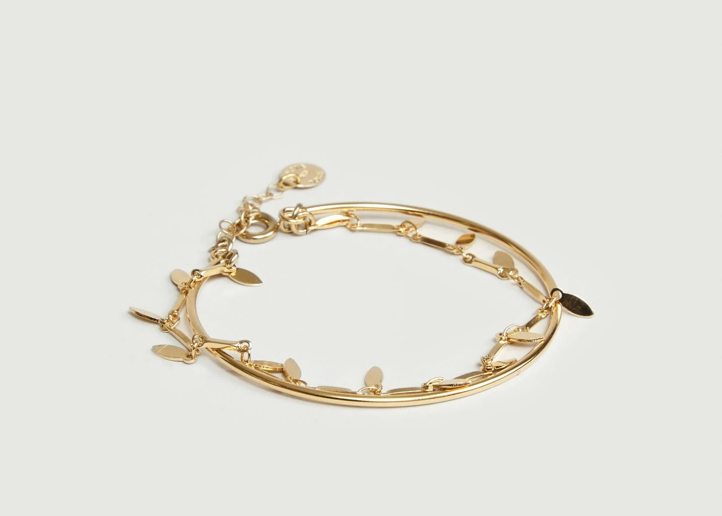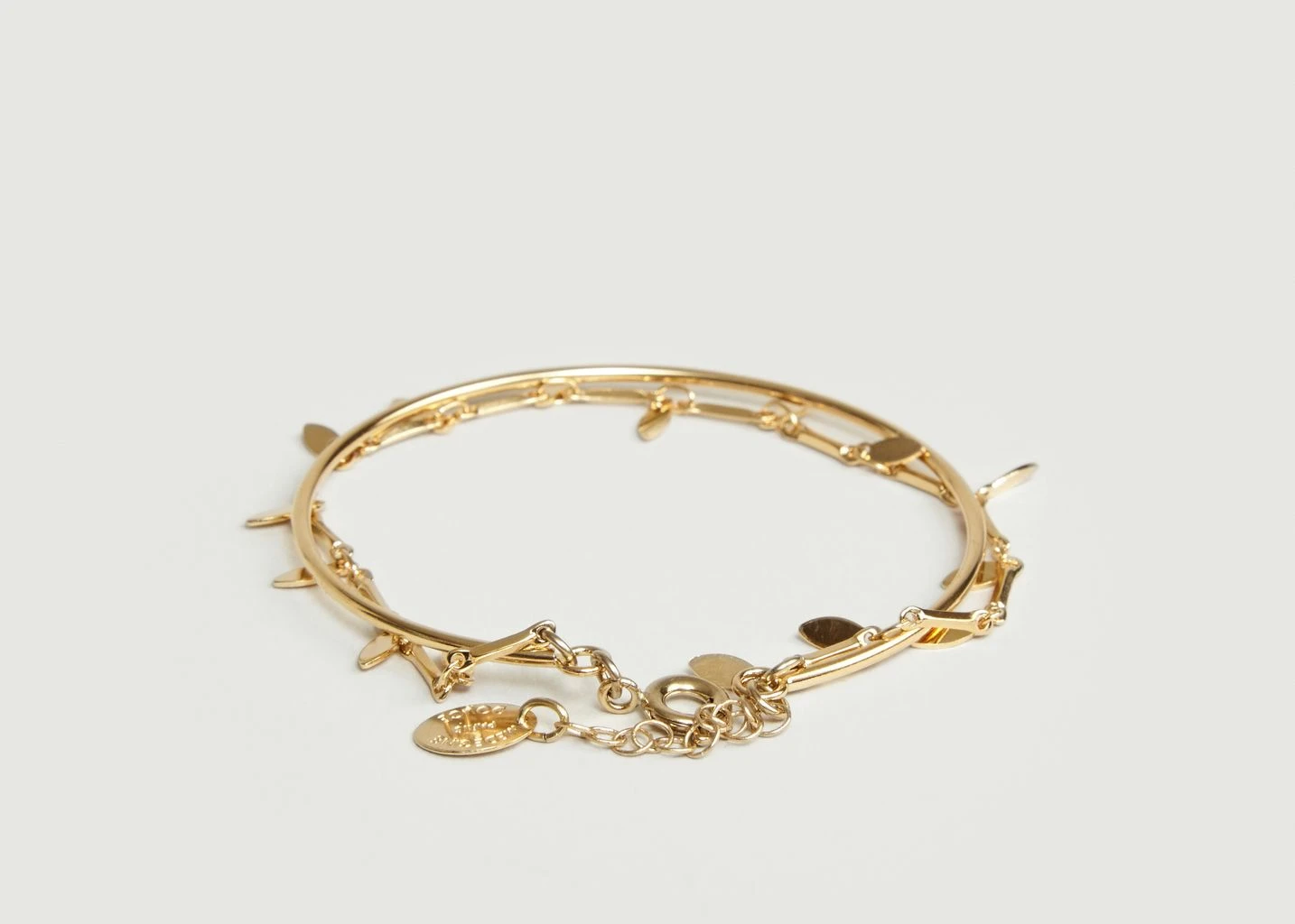 Doubled chain bracelet, composed of two parts, a rigid bangle and a chain bracelet, adjustable grip, length 15 cm. Let a fresh wind blow over your outfits by adorning yourself with this refined bracelet. Playing on a double effect, by associating a rigid bangle to a chain bracelet, Medecine Douce dress us up with softness and elegance.