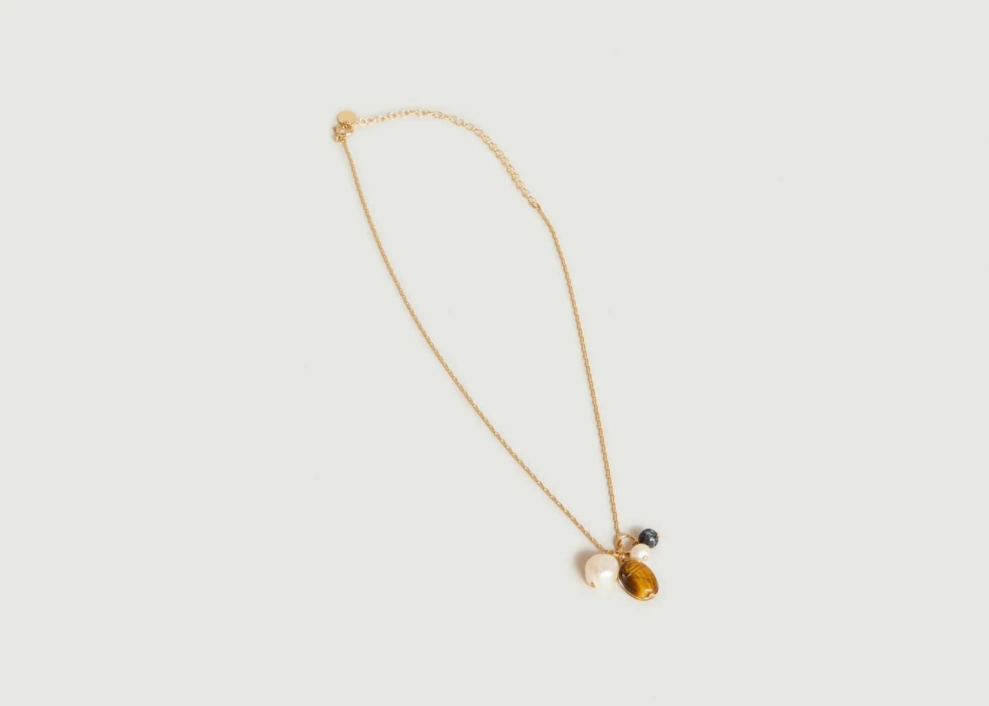 Thin brass necklace gilded with 24K gold, decorated with tiger eye, African blue opal and freshwater pearls. Adjustable length. Handmade in Paris. With a nod to Egyptian charms, the Ximena collection glows with semi-precious stones, river pearls and lucky beetles that spread their positive vibes. Adopt it to embellish your neck and make your outfit sparkle.
