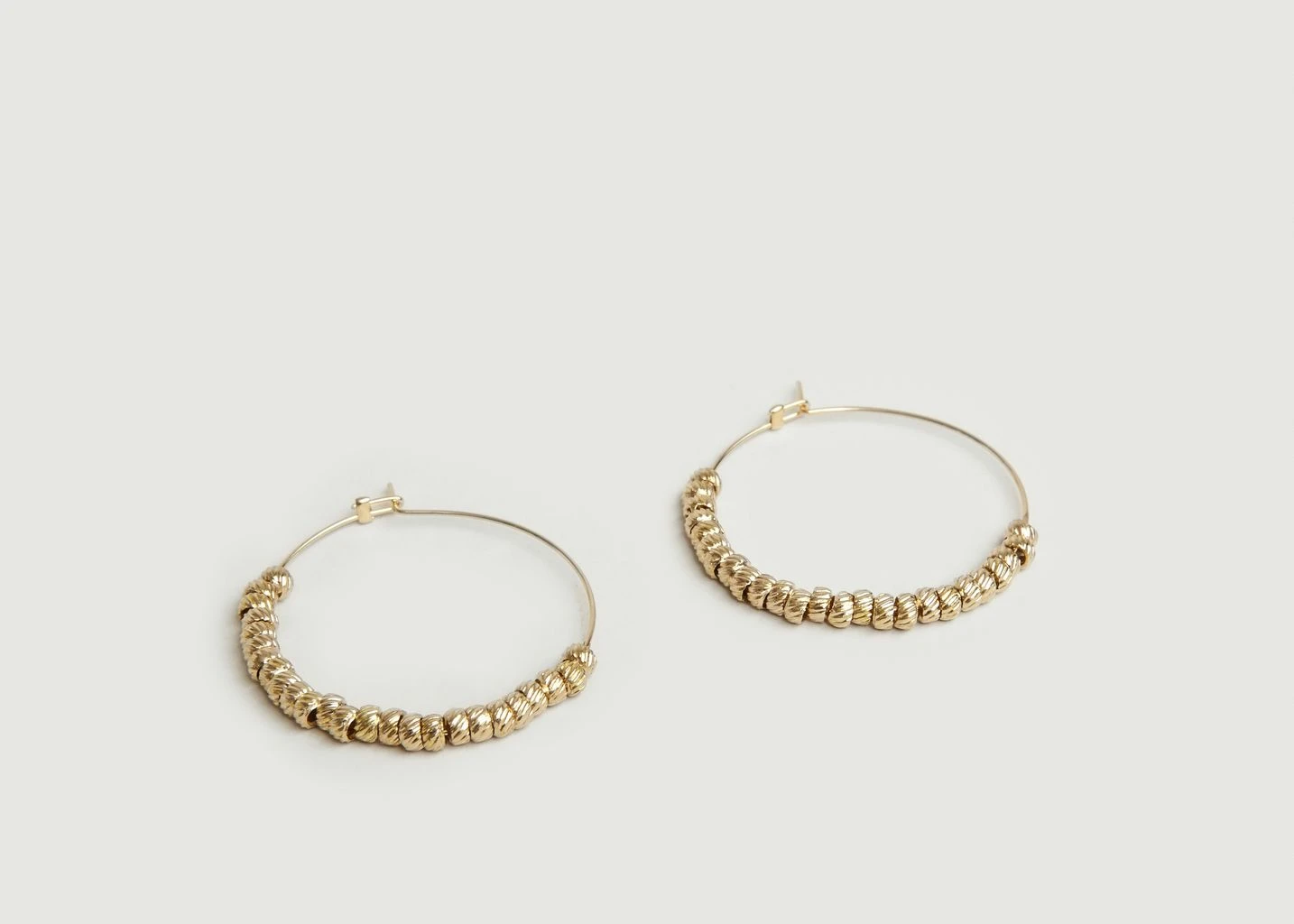 24 carat gold plated earrings, 4cm in diameter. Exploring an exotic aesthetic, Medecine Douce has created these Pataya gold plated hoop earrings for the global nomad searching for stylish and elegant accessories.