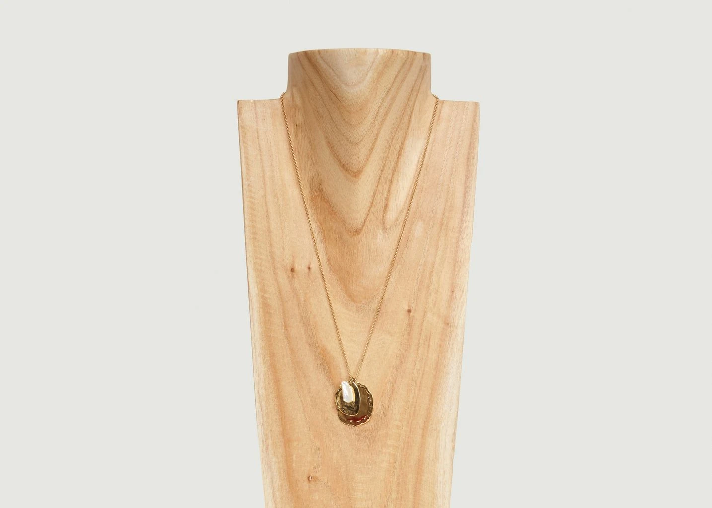 24-carat gold plated pendant necklace with hammered charms, mother of pearl detailing & embossed coin medallions . A wanderlusting collection of thoughtful and beautifully crafted designs, Marie Montaud’s ‘Medecine Douce’ collection is a melange of refined shapes, luxury base metals and striking statement adornment. With hammered charms and embossed coin medallions, the Trancrède collection is resplendent in artisanal craftsmanship and luxury detailing as reflected in this 24-carat pendant necklace.