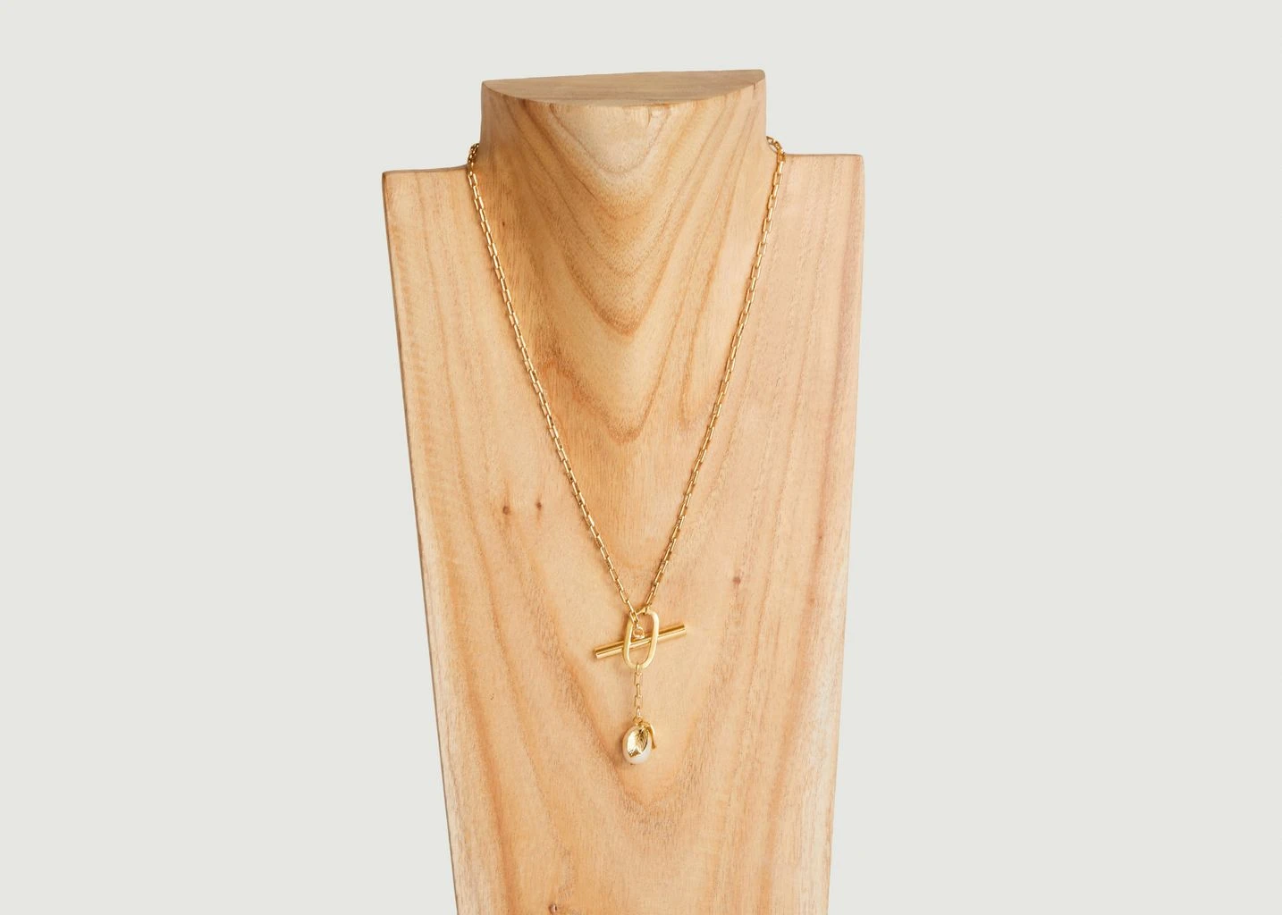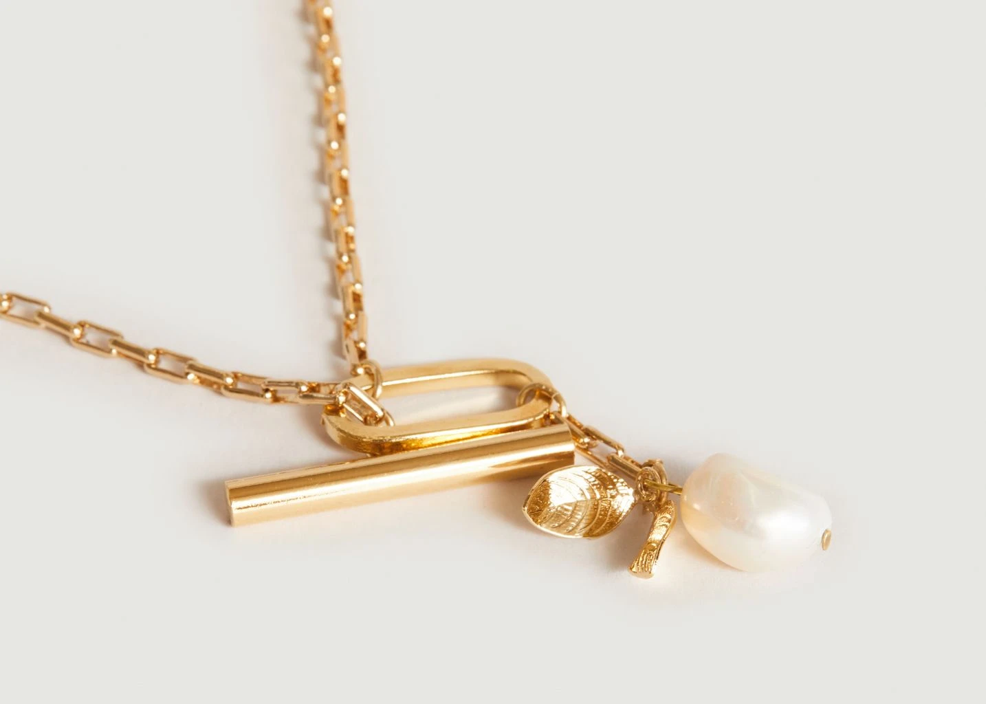 Xandra Maxi necklace made of 24k gold-plated brass with a freshwater pearl pendant surrounded by leaves. Handmade in Paris. A unique jewel with that little extra something. Delicate, we love its large elongated shape that goes equally well with a dress or a casual outfit. This necklace is ideal for spontaneous and regular use.