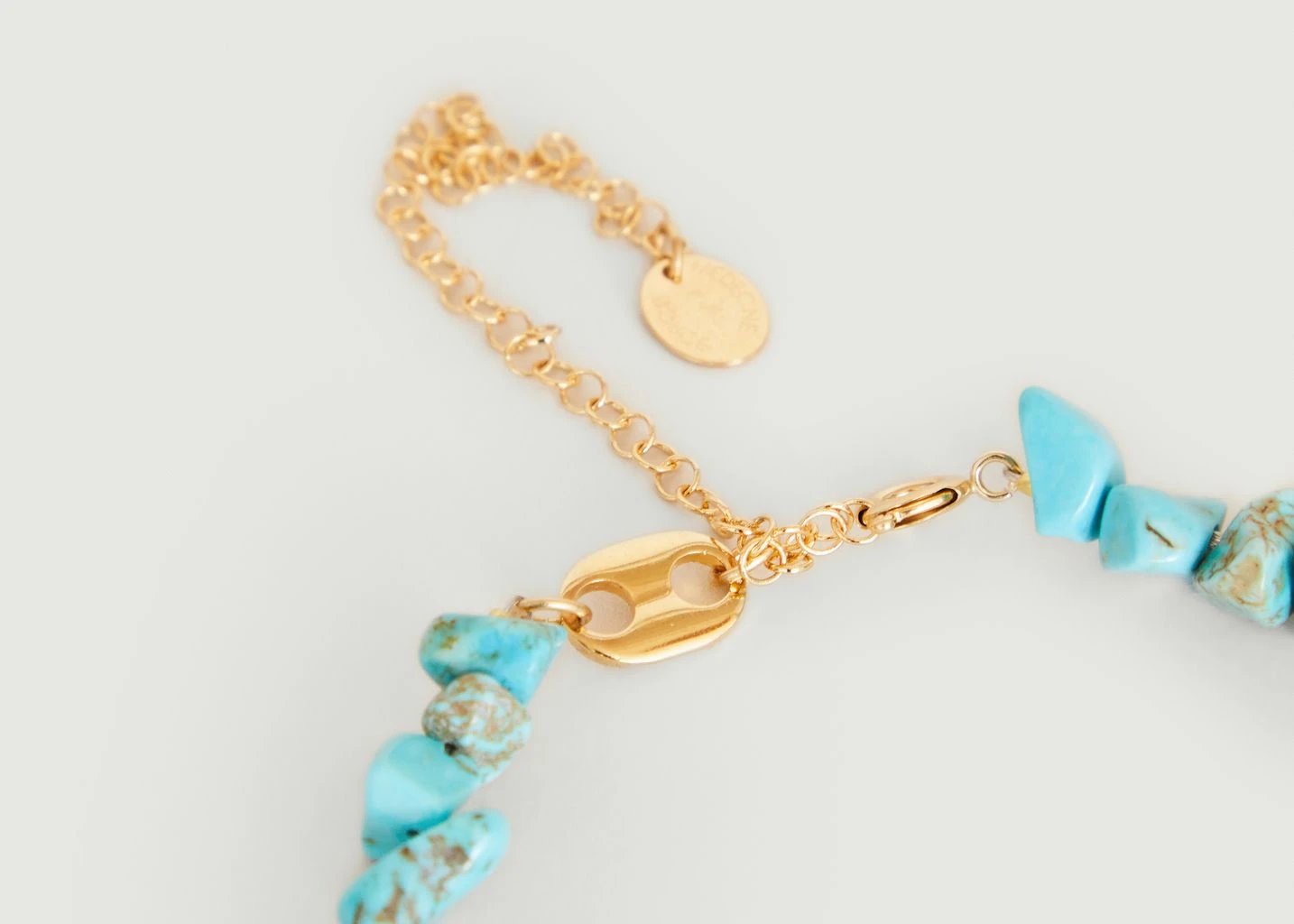 Necklace doré à l’or 24 carats et orné de pierres turquoises semi-precious. Length adjustable. Bijou factory a la main a Paris. Sublimez your tenue with the necklace Yvette signed Medecine Douce ! Clin d’œil à l’esprit mediterranean, the collection Yvette déploie ses liens d’éclats d’agate et de turquoise, comme a trait de couleur lumineux et plein d’énergie. La couleur et la forme des pierres peut varier légèrement par rapport aux photos car chaque bijou est unique.