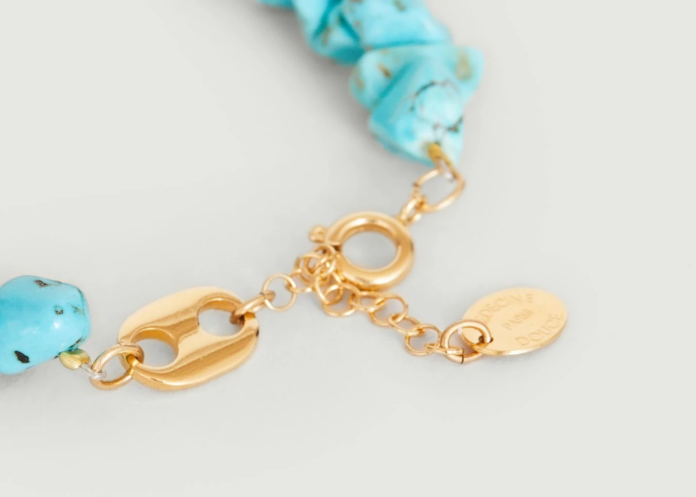 Bracelet gilded with 24 carats gold and adorned with semi-precious turquoise stones. Adjustable length from 17 to 19 cm. Jewel made by hand in Paris. Enhance your outfit with the Yvette bracelet by Medecine Douce! A nod to the Mediterranean spirit, the Yvette collection deploys its links of agate and turquoise shards, like a line of luminous color full of energy. The color and shape of the stones may vary slightly from the photos because each piece of jewelry is unique.