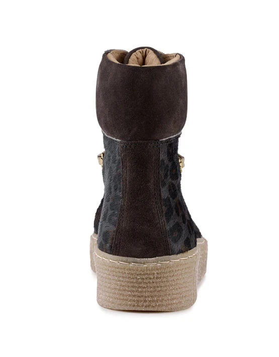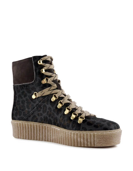 Hiking inspired boots Lace up design with D-rings and hooks Round toe Padded ankles Suede upper Grey leopard print Chunky crepe sole Sole height: 3 cm Shaft height: 18 cm, Shaft width: 8 cm Shoe the Bear Size: 3