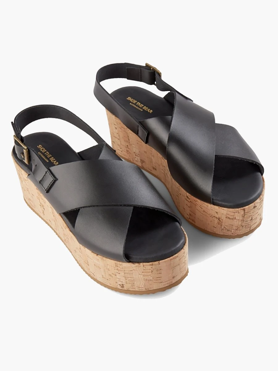 A perfect casual sandal, The Begonia Ankle Wedge by Shoe the Bear can be easily worn with skirts, jeans and dresses. With it’s plaited strap design and cork platform these sandals are stylish, comfy and easy to wear. Black lace strap Adjustable buckle fastening Cork platform 6.5cm height Composition: Leather