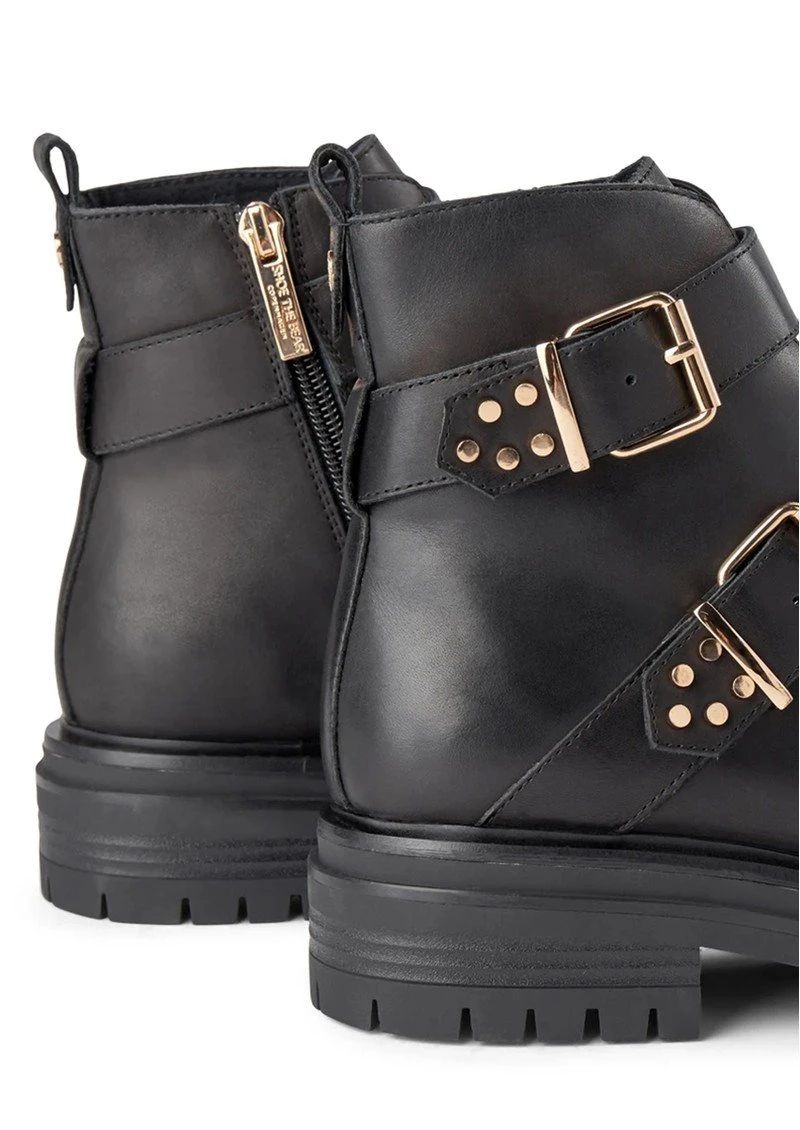 New Franka Strappy Boot made from a smooth black leather. This style features: Smooth black leather boot with stud detailing and buckles Chunky rubber sole which measures: 4.5cm Rounded toe Leather linine inside