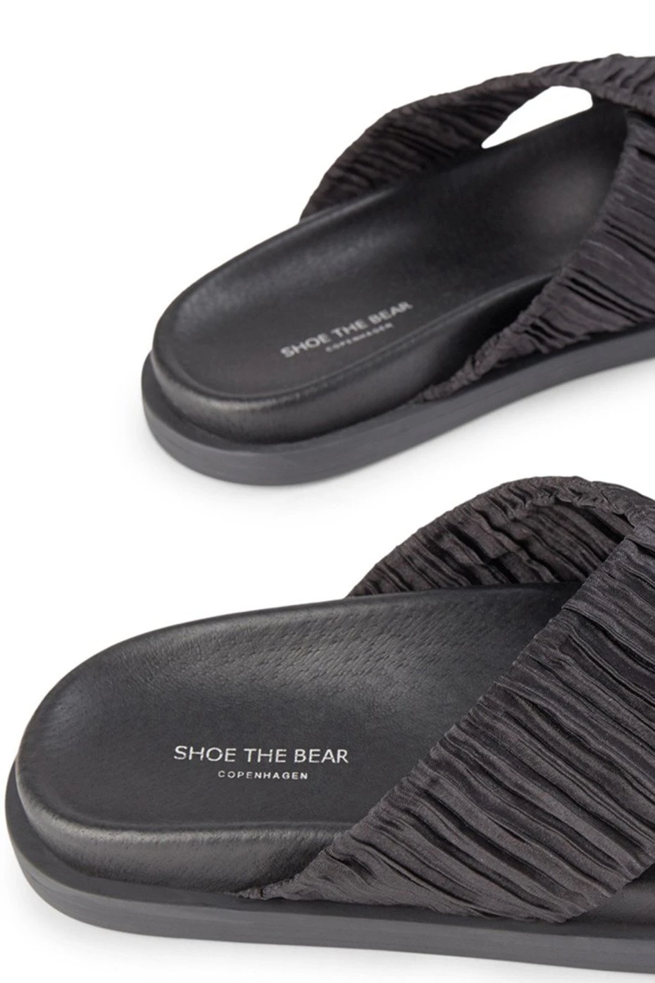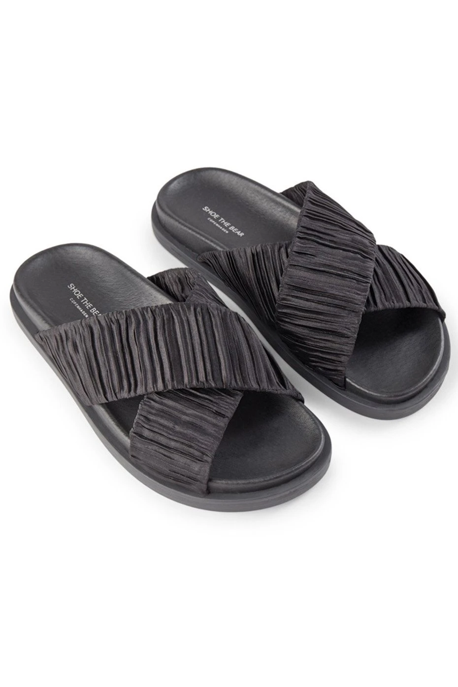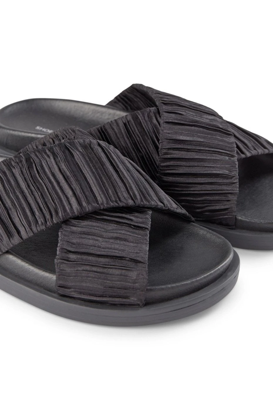 Boasting a wide pleated satin satin cross strap, the Ivy Mule is an easy to wear, everyday slip on sandal. The foot-shaped rubber sole, makes them extra comfortable, while the pleated detail adds a contemporary look.