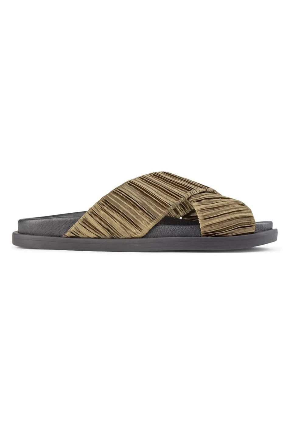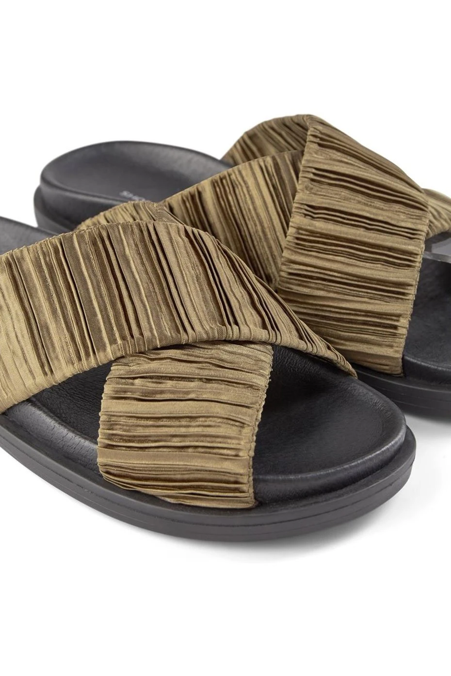 Boasting a wide pleated satin satin cross strap, the Ivy Mule is an easy to wear, everyday slip on sandal. The foot-shaped rubber sole, makes them extra comfortable, while the pleated detail adds a contemporary look.